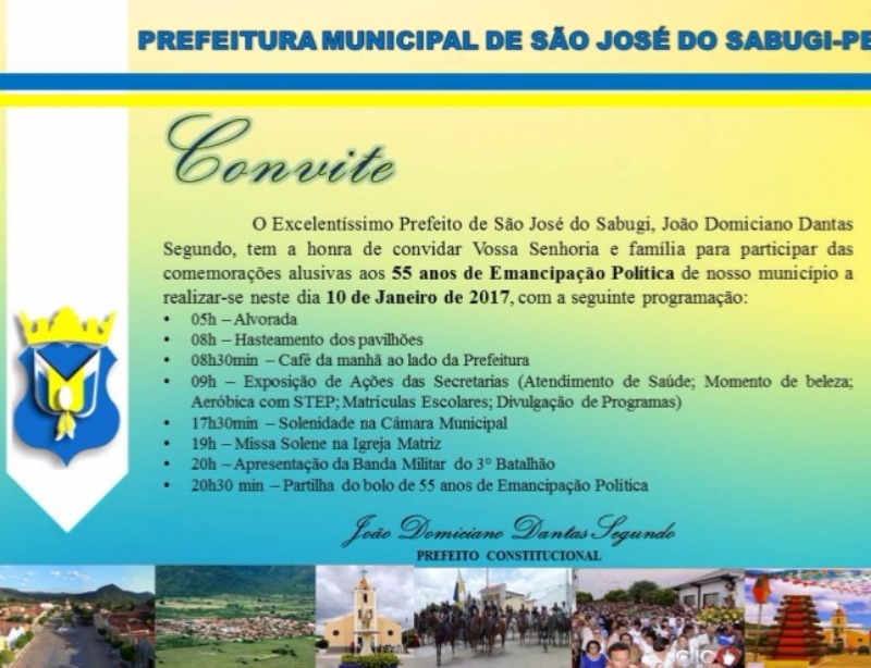 O Excelentíssimo Prefeito de São José do Sabugi, João Domiciano Dantas Segundo, tem a honra de convidar Vossa Senhoria e família para participar das comemorações alusivas aos 55 anos de Emancipação Política de nosso município a realizar-se neste dia 10 de Janeiro de 2017, com a seguinte programação: