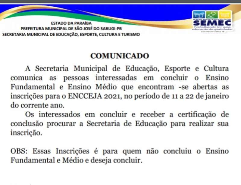 A Secretaria de Educação de São José do Sabugi está com o período de inscrição aberto aos alunos interessados na conclusão do ensino fundamental e médio através do Exame Nacional para Certificação de Competências de Jovens e Adultos (ENCCEJA).O período de inscrição acontece de 11 a 22 de janeiro e os interessados devem comparecer na sede da Secretaria de Educação. O ENCEJJA é oportunidade para pessoas que por algum motivo não conseguiram concluir os estudos. .