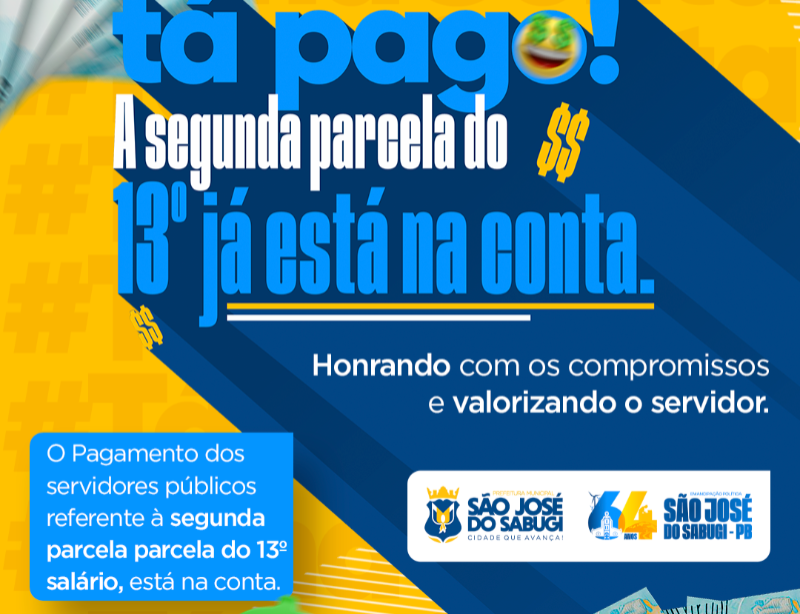 Com o compromisso de valorizar o funcionalismo público, a Prefeitura de São José do Sabugi efetuou, nesta quarta-feira (17), o pagamento da segunda parcela do 13º salário destinado aos servidores públicos. A informação foi divulgada pela Secretaria de Finanças.